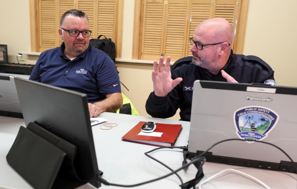 Andrew Mitton, Director of Operations at the Department of Emergency Management (left), and Scott Fisher, Senior Field Communications Officer at the Department of Emergency Management, discuss operations. (Province of Nova Scotia)Debbie Weihers, President of the Morristown Community Club, volunteers at the command post to help the crews working on the fire. (Province of Nova Scotia)Cards made by students at Champlain Elementary School to thank firefighters for their efforts. (Province of Nova Scotia)A Grade 5 student’s thank you card to firefighters, with part of the incident command post in the background. (Province of Nova Scotia)