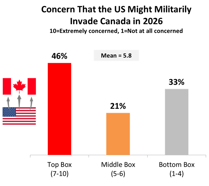 National results of the survey indicated 46 percent of all Canadians fear an American invasion is possible this year.